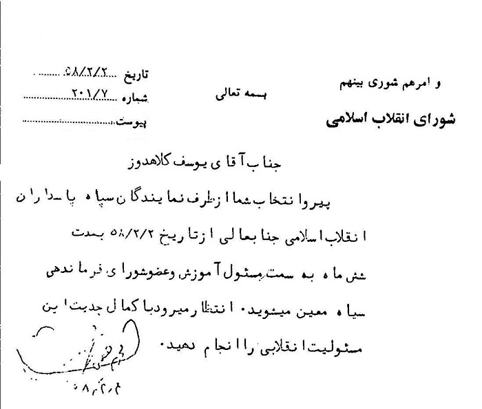 در تاریخ دوم اردیبهشت 1358 تنها پس از گذشت دو ماه و ده روز از پیروزی انقلاب اسلامی، بعد از تجمیع و ادغام چهار گروه مختلف که هر کدام بنا به فرمان امام خمینی برای تشکیل سپاه تلاش زیادی کرده بودند، نهایتا سپاه پاسداران بهطور رسمی و با حکم شورای انقلاب شروع به کار کرد. در همان روز، شهید بهشتی که دبیر شورای انقلاب بود حکم فرماندهی سپاه و دیگر اعضای شورای فرماندهی را امضا کرد و به ساختمان سپاه برد و بین نماز ظهر و عصر به هفت نفر از اعضای منتخب شورا داد. سند فوق حکمی است که شهید بهشتی به یوسف کلاهدوز داد و او را به سمت عضو شورای فرماندهی سپاه و مسئول آموزش سپاه منصوب کرد.