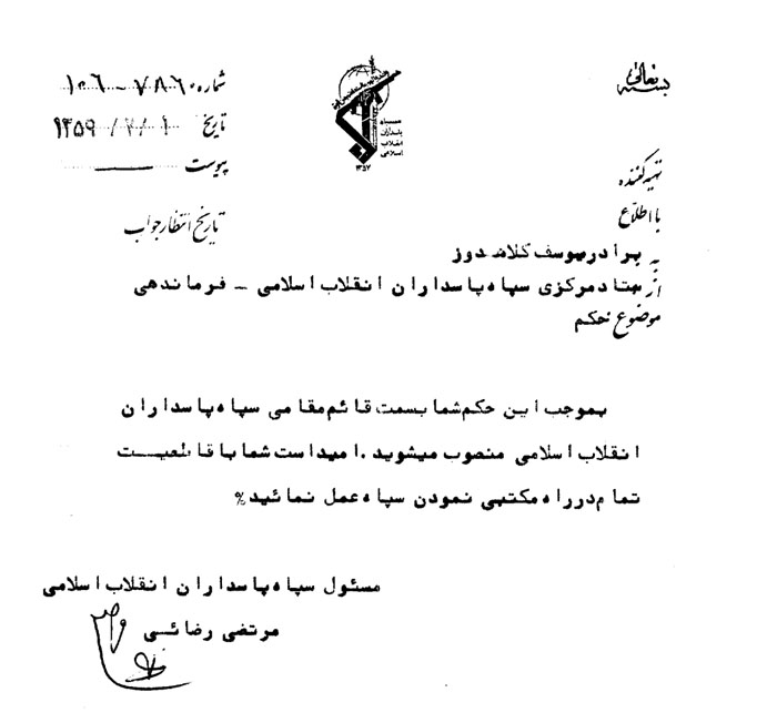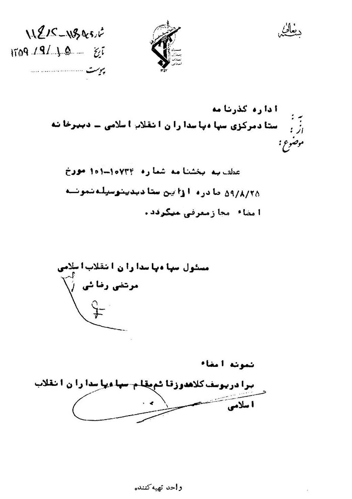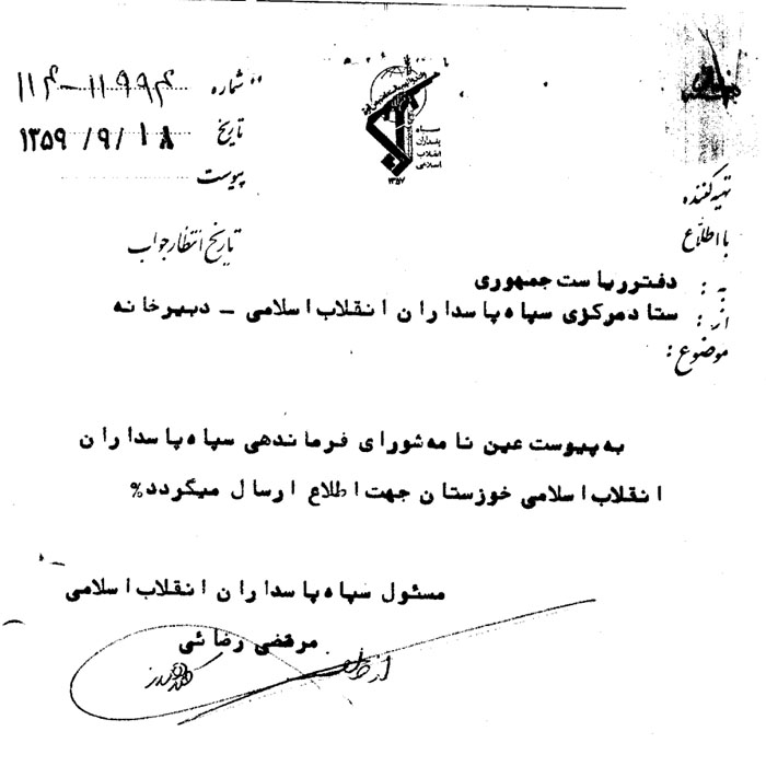 معرفی فرمانده و شش معاونت سپاه پاسداران انقلاب اسلامی به همراه نمونه امضا و مهر رسمی سپاه به دولت بازرگان؛ فرمانده سپاه: جواد منصوری، مسئول اداره عملیات: ابوشریف، مسئول اداره آموزش: یوسف کلاهدوز، مسئول اداره روابط عمومی: یوسف فروتن، مسئول اداره تحقیقات و اطلاعات: علی محمد بشارتی، مسئول اداره تدارکات: محسن رفیقدوست، مسئول اداره مالی و اداری: اسماعیل داودی