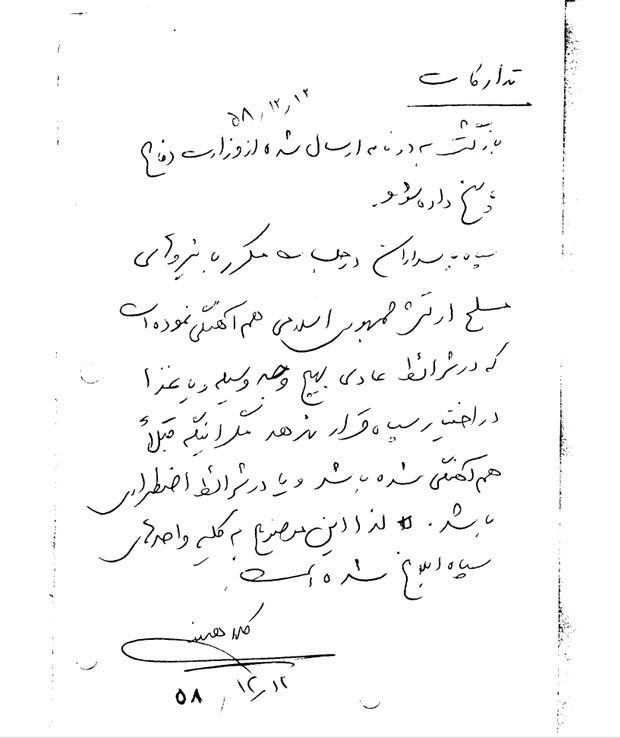 دستور شهید کلاهدوز به واحد تدارکات مبنی بر عدم دریافت غذا و تجهیزات از ارتش که بدون هماهنگی باشد.