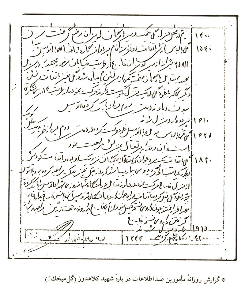 1400 [منظور ساعت 2 بعدازظهر است] تیم در محل منزل گل میخک [منزل یوسف کلاهدوز] و مسیر پادگان لویزان [محل کار شهید کلاهدوز] موضع گرفت.