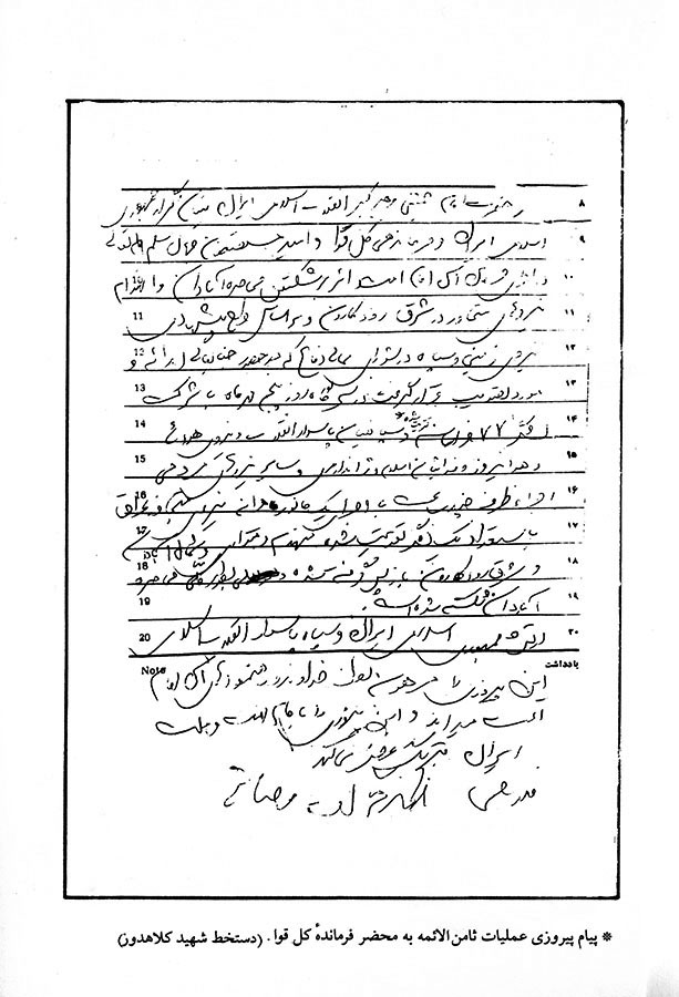 بعد از پیروزی عملیات ثامن الائمه (شکست حصر آبادان) فرماندهانِ عملیات، تلگرافی به بیت حضرت امام خمینی فرستادند و گزارش فشرده و کوتاهی از پیروزی عملیات دادند. متن این تلگراف که توسط شهید کلاهدوز آماده شده بود بعد از انفجار هواپیمای سی 130 در کیف نیم سوخته شهید پیدا شد. سند فوق برگی از دفتر سررسید شهید کلاهدوز است که متن این تلگراف در آن نوشته شده است.